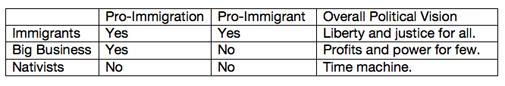 WE TALK about the immigration debate as if there are two sides but there are actually three sides and two debates--one about immigration and the other about the rights and humanity of immigrants. Here's a little table to help sort it out: